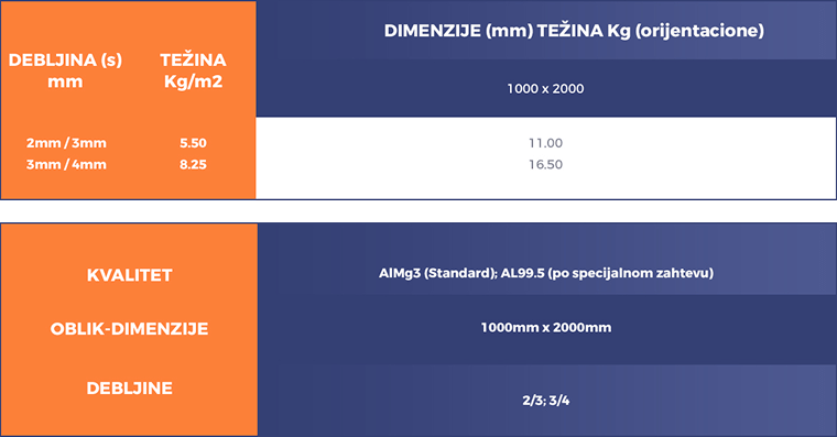 Za planiranje nabavke i logistike, orijentaciona težina tabli se može računati po formuli: debljina (mm) × širina (m) × dužina (m) × 8 (u nekim slučajevima i 7,8).